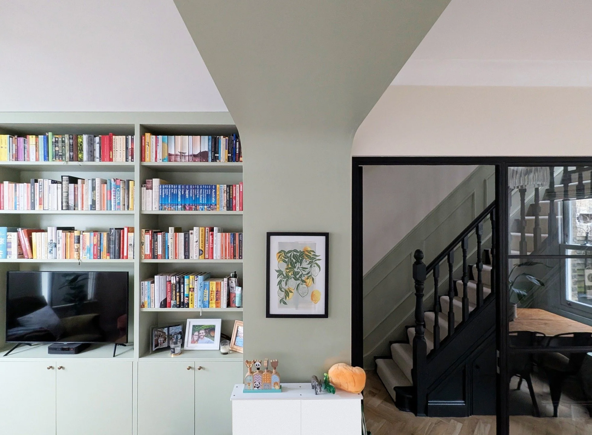 We reimagined the entrance sequence and ground floor living spaces, introducing steel-framed partitions, playful built-in shelving, and tonal shifts of soft greens and tactile finish