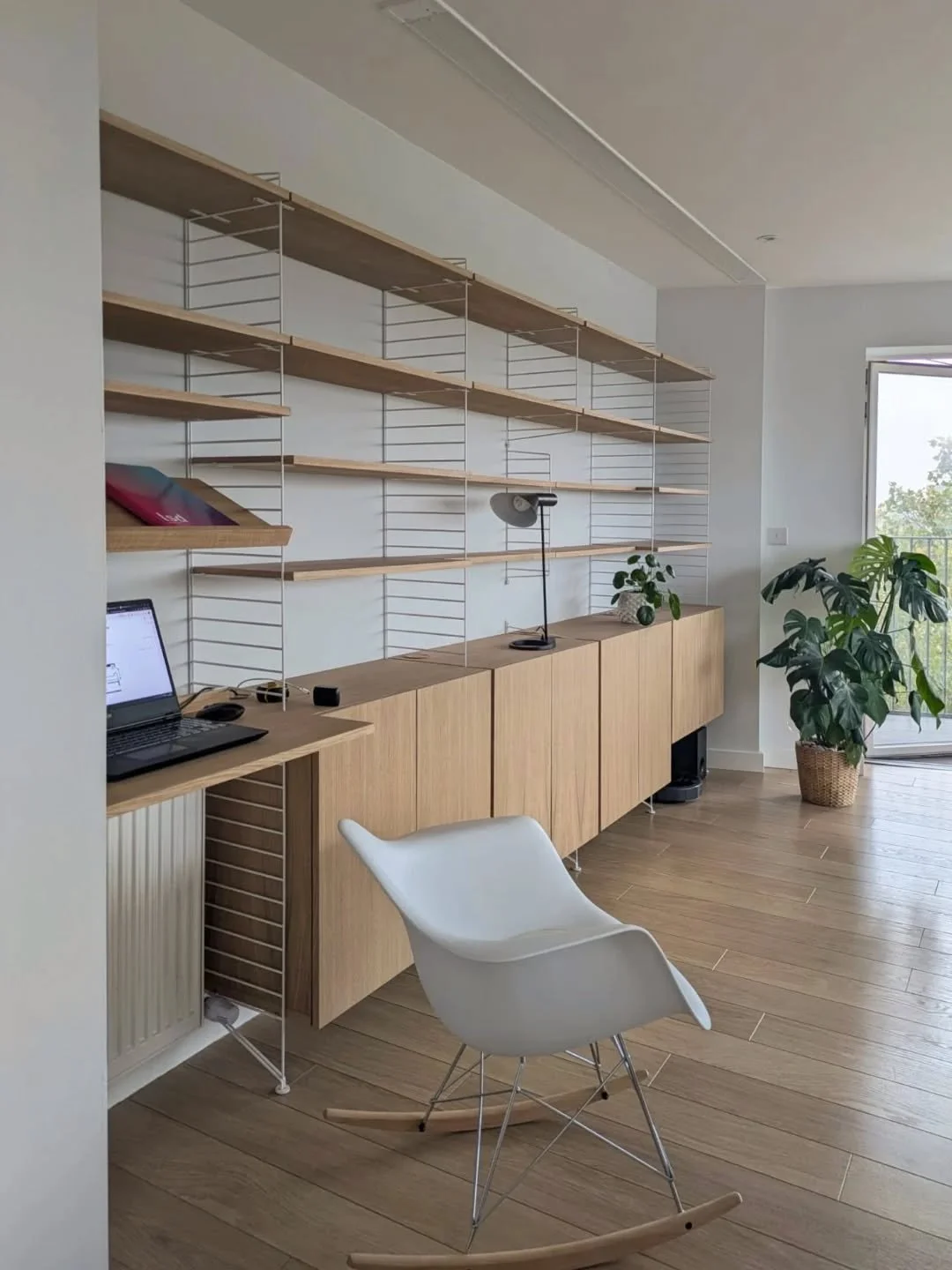 At first glance this looks like a classic String shelving system, but in reality it’s a carefully considered mix of off-the-shelf vertical components and bespoke joinery. The result is more than just stora