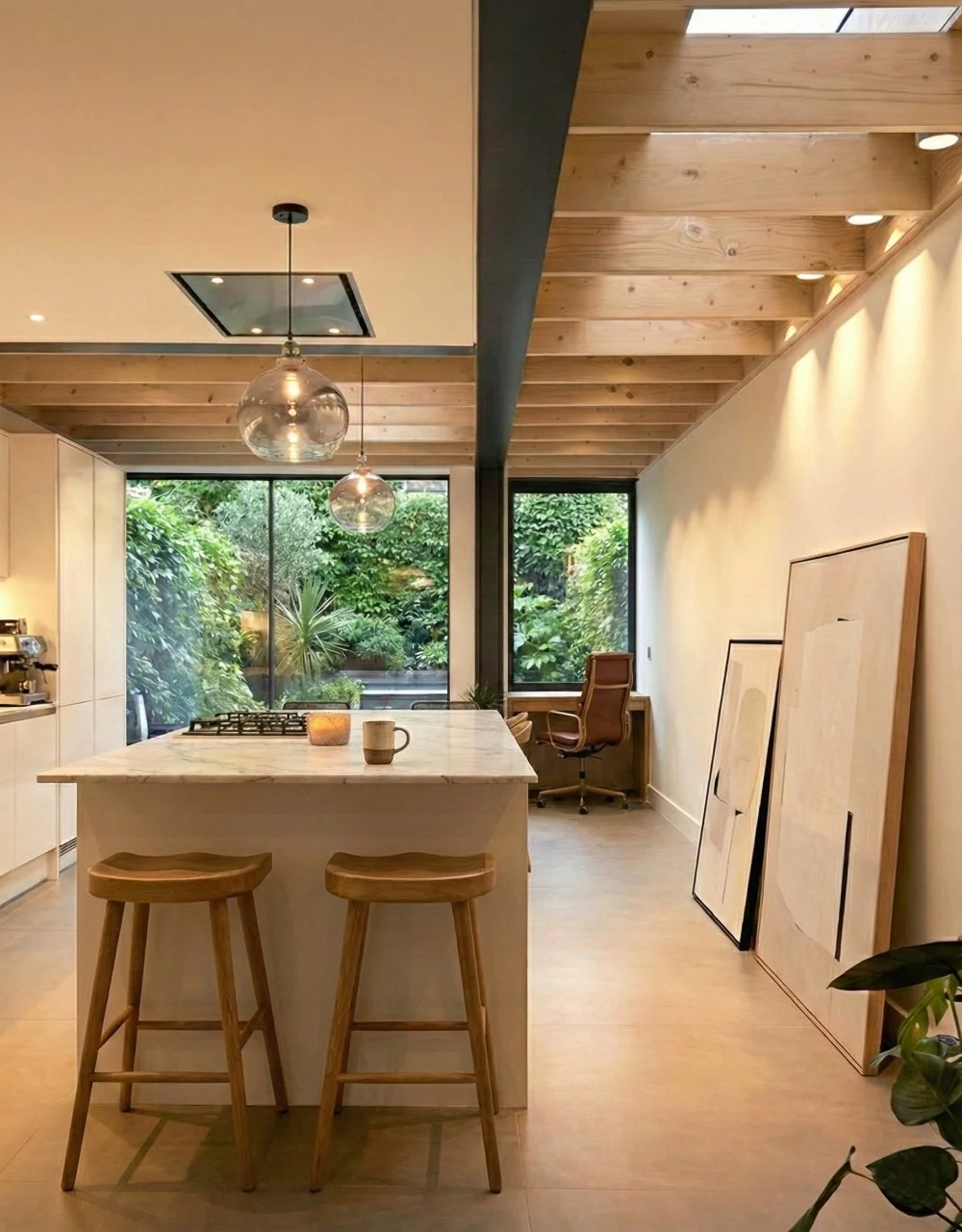 Exposed timber joists meet crisp white planes, with a central steel beam holding the rhythm and framing the long garden view.